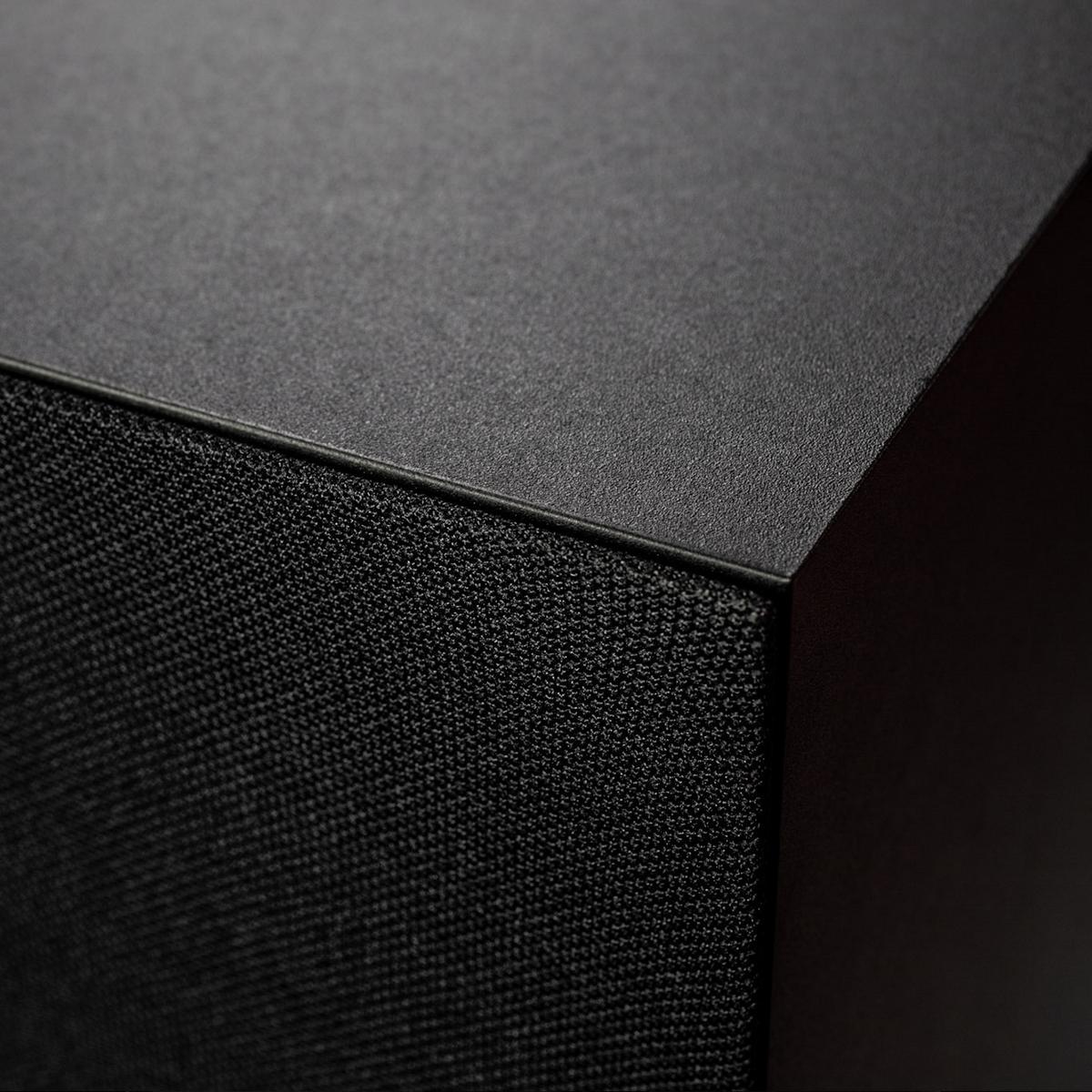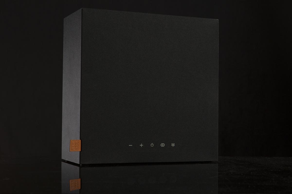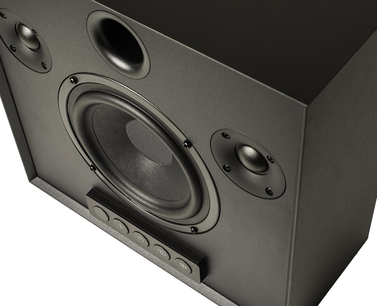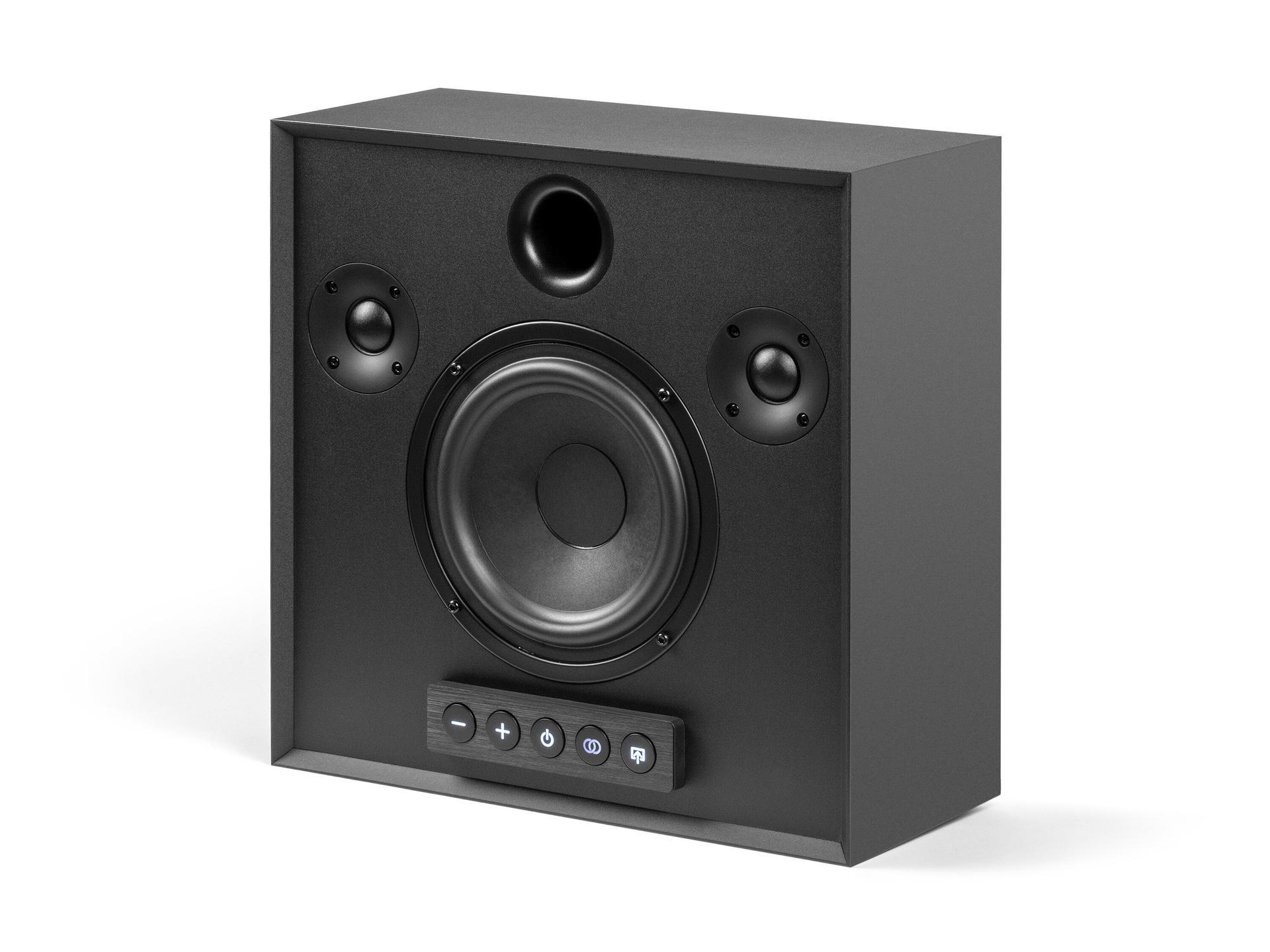 Активная беспроводная колонка в конфигурации 2.1. Плоский корпус для удобного размещения: СЧ-динамик диаметром 6 дюймов с двойным магнитом и два 1-дюймовых твитера с мягким куполом, фазоинвертор на передней панели. Раздельные усилители мощностью по 50 Вт, DSP-обработка сигнала. Bluetooth с поддержкой aptX, вход на разъеме mini-jack. USB-разъем для питания внешних устройств. Габариты (ШхВхГ): 330x330x150 мм.