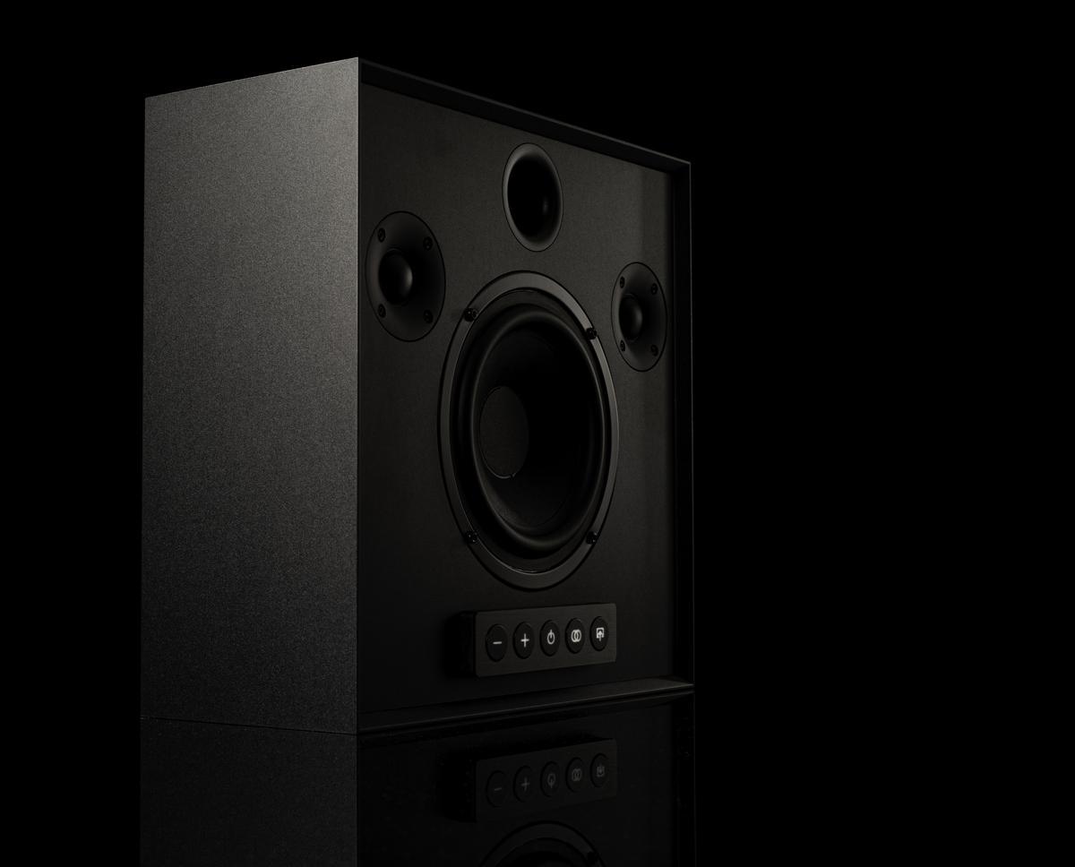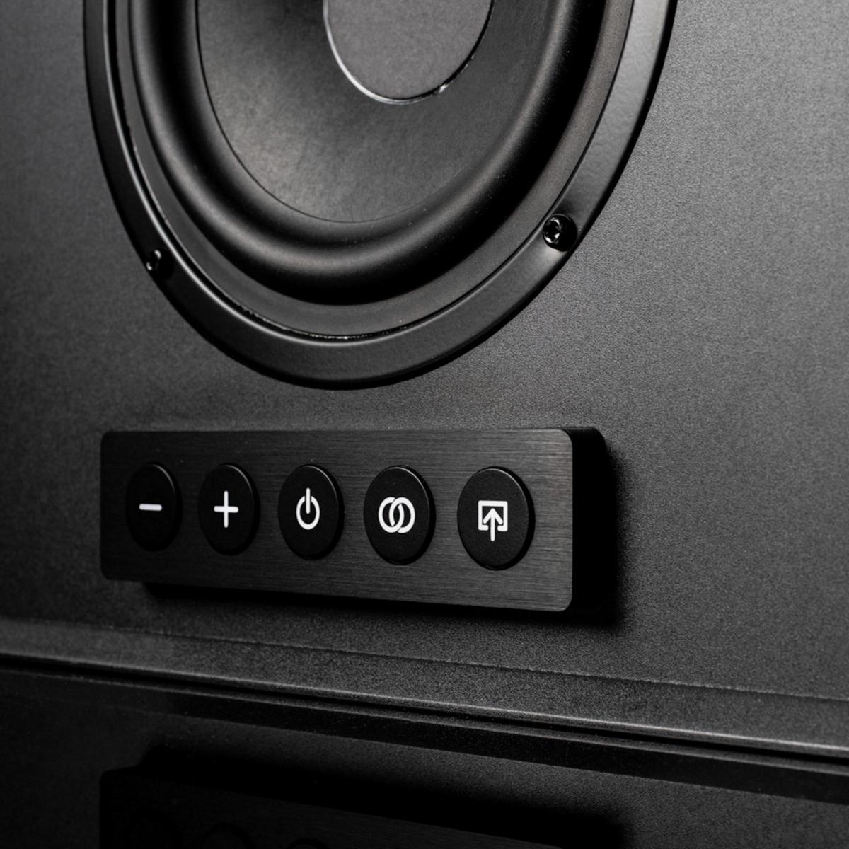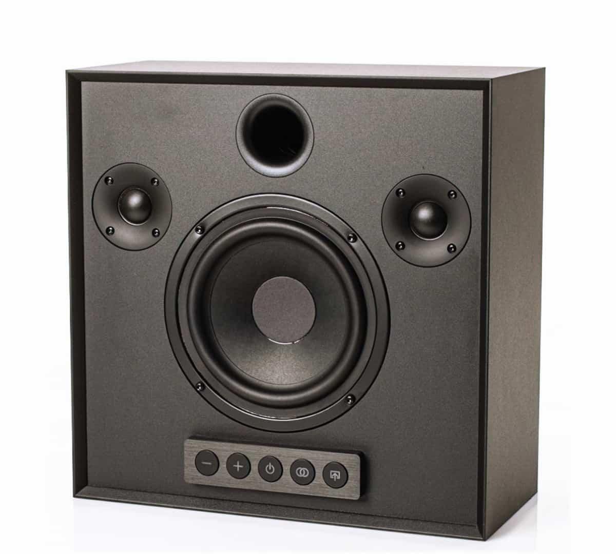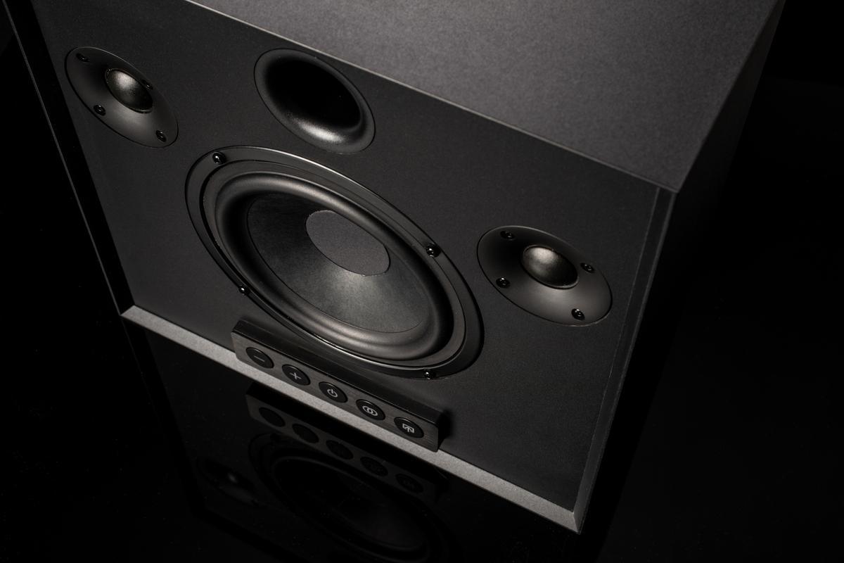 Активная беспроводная колонка в конфигурации 2.1. Плоский корпус для удобного размещения: СЧ-динамик диаметром 6 дюймов с двойным магнитом и два 1-дюймовых твитера с мягким куполом, фазоинвертор на передней панели. Раздельные усилители мощностью по 50 Вт, DSP-обработка сигнала. Bluetooth с поддержкой aptX, вход на разъеме mini-jack. USB-разъем для питания внешних устройств. Габариты (ШхВхГ): 330x330x150 мм.